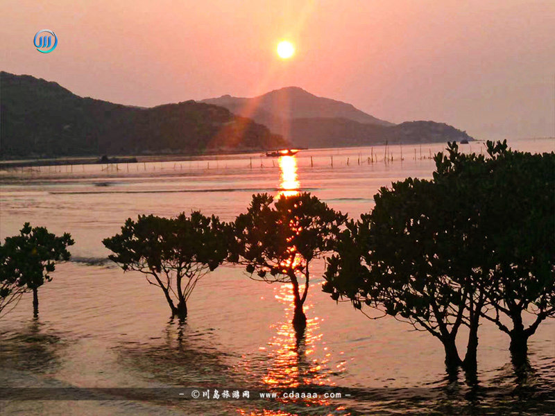 上川岛红树林材质呈红褐色,枝叶是深绿色,它是受海水周期性浸淹的木本植物群落,被誉为“海上森林”,海水涨潮时,仅有树冠露出水面,婆娑起舞,别有一番情趣。它是渔船的“避风港”,是地球上三个自然生态系统中生物能力最强的一个。