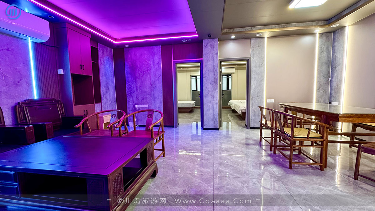 两房一厅 | 大厅设专用茶桌与休闲桌椅,房间都设有独立卫生间,有免费洗衣机提供使用。